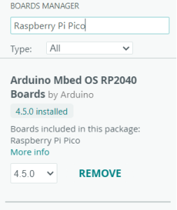 Писать программный код мы будем в среде программирования Arduino. Для начала установим нужные библиотеки для работы с платой: в Boards Manager ищи “Raspberry Pi Pico/RP2040”